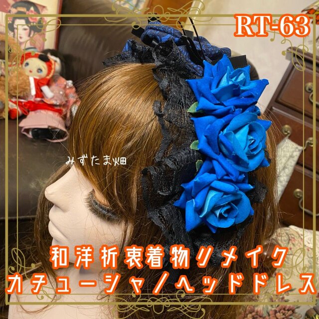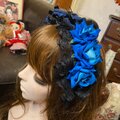 【着物リメイク ハンドメイド おりぼん ティアラ ヘッドドレス トークハット カチューム カチューシャ ヘアアクセサリー 和洋折衷の美しさを纏う レトロ 和ロリータ 瑠璃ローズ×黒レースのアシメ・ボリューム RT-63】