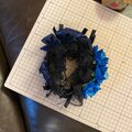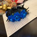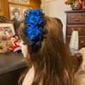 片側に瑠璃色のローズを3輪連ね、もう片側には藍色の着物地リボンと黒サテンのリボンを重ねたアシンメトリーデザイン。黒レースのフリルが顔まわりを引き締め、青の発色をいっそうドラマティックに見せます。前・横・後ろどこから見ても立体的で写真映え抜群。青×黒コーデ、和ゴシック、着物・浴衣・ワンピまで相性ばっちり。一点投入でコーデが完成する、世界にひとつの主役級アクセです。