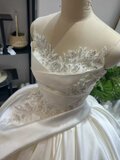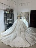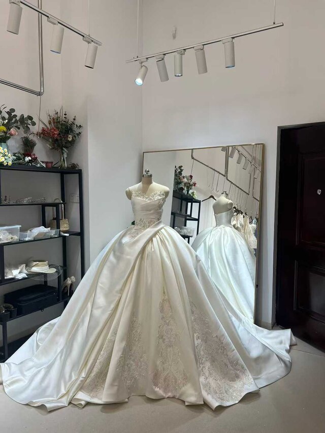 ウェディングドレス ベアトップ キラキラ光る刺繍 ミカドサテン ロングトレーン 韓国風ドレス 前撮り