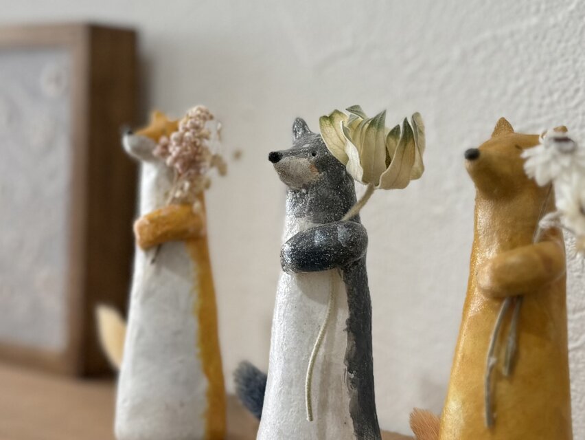 昨晩、無事に届きました。小さなお家にドライフラワーをアレンジすると、相乗効果で空間が生き生きしてきます。 ねずみ猫も、お家の横に並べるとより一層かわいらしさが伝わってきます。 これからも、良い作品創りを祈っています!
