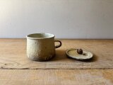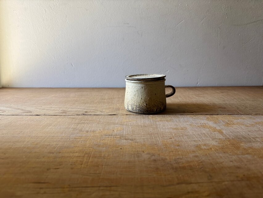 アンティークな台形のマグに蓋になる小皿をセットした作品。