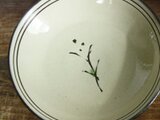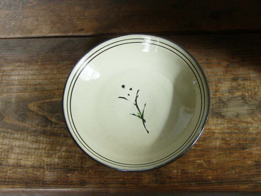 素地に化粧泥を掛けて野花を描き、透明釉を施釉してから部分的に織部釉を彩色し焼成しています。