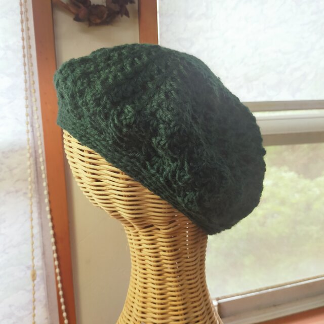イギリス製の深いグリーンの並太ウールでベレーを編みました。