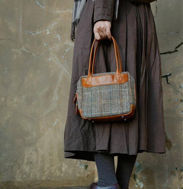 英国製「Harris Tweed(ハリスツイード)」と本革を組み合わせた、ミニサイズのスクエアトートバッグです。