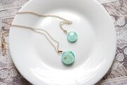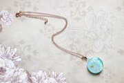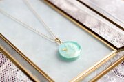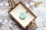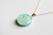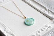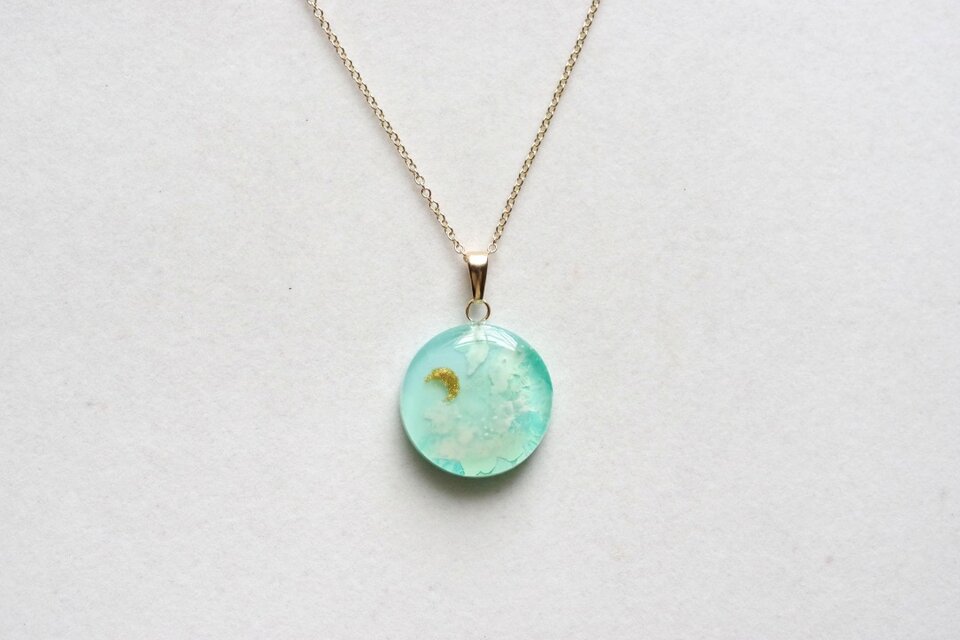 鮮やかでありながら優しい緑色の空に浮かぶ金色の三日月を描き加えた、小さくも雄大な世界を感じられるペンダント。
