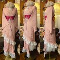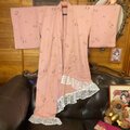 【単衣着物 2way アシンメトリー ガウン 羽織り ドレス ワンピース ハンドメイド 和洋折衷 洗える 化繊 リメイク 名古屋帯サッシュベルト レトロ 古着 さくら糖ピンクに木の実のリース KD-72】