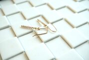 ジルコン7粒の間(一か所)にこちらもとても小さなゴールドビーズを挟んでいます。左右でゴールドビーズを挟み込んだ場所が違っていますが、左右非対称を楽しんでいただけましたらうれしいです。カットがほどこされた石たちは、ゆらゆら揺れると光を受けてきらきらと輝きます。