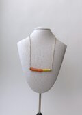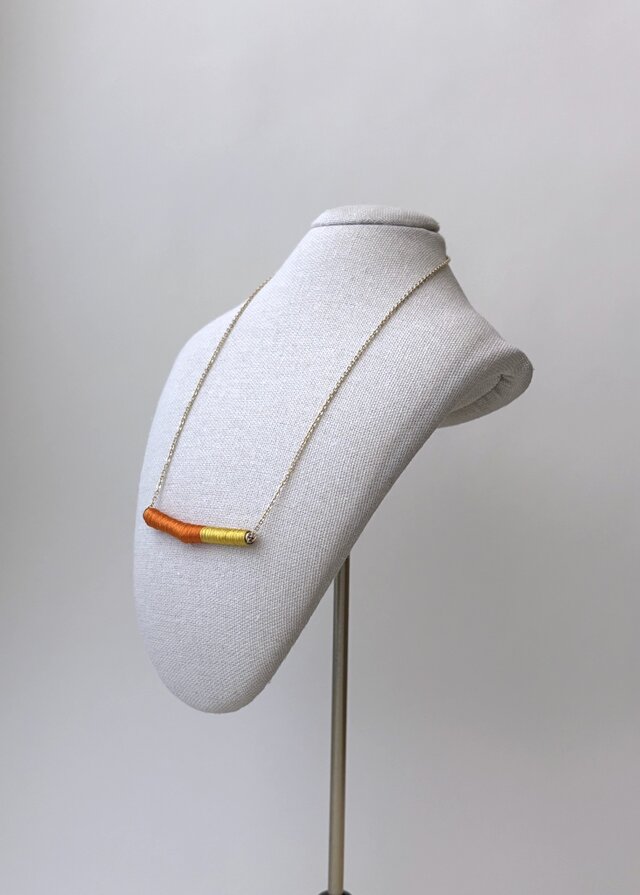 このネックレスはオレンジとイエローの2色を使い明るくポップな印象の1点に仕上げました。鮮やかな色で元気になる作品です。