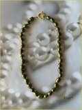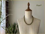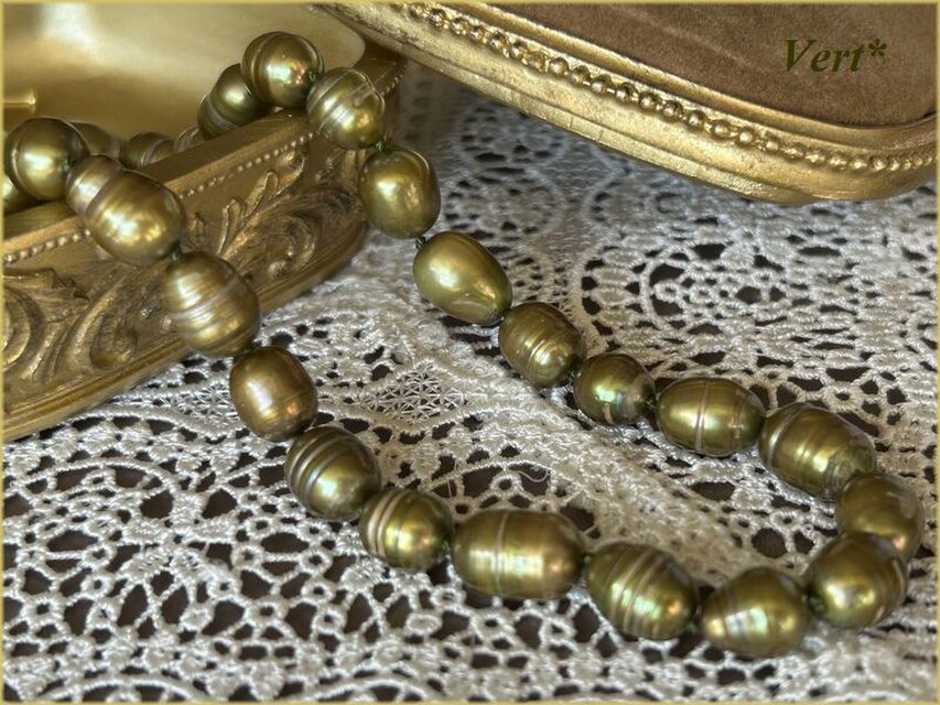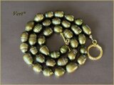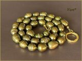 グリーンゴールドカラー染の縞入り大粒バロック(ライス風)パールをひと粒ごとにグリーンのシルクコードで結び留めたオールノット仕立てのショートネックレスです。シンプルなデザインですが重厚感と存在感があるアンティークな印象のネックレスに仕上がっています。