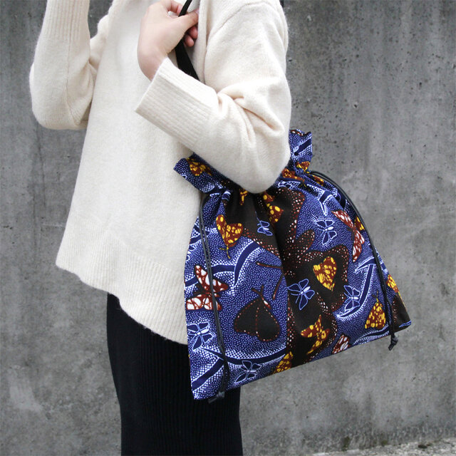 アフリカ布の巾着バッグ(バタフライ・蝶)トート 大きめ アフリカンプリント