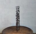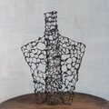 ワイヤーを編んで制作したオブジェです。錆びたような質感は、黒土を接着剤で練ったものを固着させて出しています。真ん中にガラス管をセットできるようにしてあるので、生花を生けることができます。ガラス管は底の部分から差し込んでせっとします。ドライフラワーはそのまま飾れます。とても軽いので、ダルマピン1本で壁に掛けることもできます。照明の当て方で美しい影が現れます。