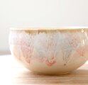 ころんと丸い幅広のボウルの形に成形後、全体に艶やかな白い釉薬をかけ、秋をイメージした様々な色合いの釉薬を使用して色付けをしました。