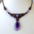 みずみずしく透明感があり内部にクラックがありますが、独特な紫のグラデーションが幻想的なインド産ファントムアメジストと上部には小粒ながらも見る角度によって現れるブルーシラーが美しいムーンストーンを合わせたマクラメ編みチョーカーネックレスです。