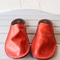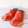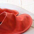 鮮やかなトマトレッドに近いオレンジレザーが印象的で、光の当たり方によって赤にも橙にも見える、まさに“生きた色”をしています。単調ではなく、わずかな色むらが天然革ならではの豊かな表情を生み、手仕事の温もりが伝わってきます。