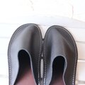 アッパー部分は深みのあるマットブラックのシュリンクレザーで、自然なシボ(細かな凹凸)が美しく光をやわらかく反射しています。手触りはしっとりと上質で、使い込むほどにツヤが増していくタイプ。