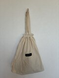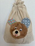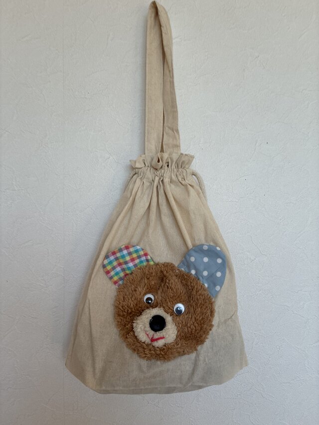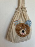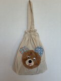 生成り色の巾着バッグに、ふわふわのくまの作品を縫い付けました。