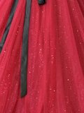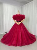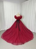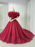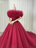 豪華!カラードレス ボルドー色 取り外しオフショルダー シークインチュール サッシュベルト ボリュームドレス 前撮り