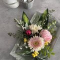 ベビーピンクのばらとガーベラを根じめに束ねました。