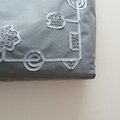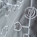 リボンテープで一筆書きに花など型取り縫い付けてビーズを散らせました。
