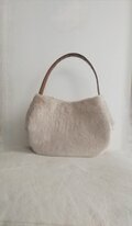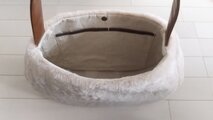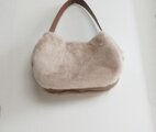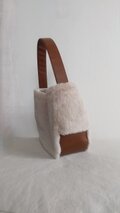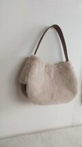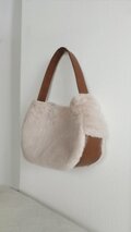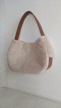ペールベージュの短毛のずっと触っていたくなる柔らかい肌触りのスーパーラビットボア(フェイクファー、エコファー)に、持ち手と底布にキャメルのフェイクレザーを合わせたワンショルダーバッグです。