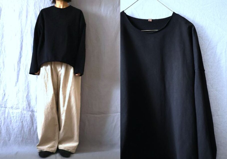 【受注制作】黒/コットンストレッチ裏毛 切りっぱなしゆったりトレーナー