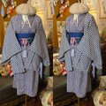 【 着物リメイクワンピース アンサンブル 名古屋帯サッシュベルト付き 和洋折衷 ハンドメイド レトロ 古着 藍紺×生成り 菱つなぎ小花 aKW-95】
