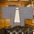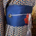 深い藍紺をベースに、生成りと朱の三角が連なる細やかな菱つなぎ。菱の中心に山吹〜橙の小花が点在し、レトロでリズミカルな表情が魅力です。濃紺の帯風ベルト(花刺繍)と藤色タッセル紐でキュッと締めれば、清涼感ときちんと感を両立した和洋ミックスに。ベレーやローファー、ブーツとも好相性で、季節を問わずお出かけや撮影にも映える一着です。