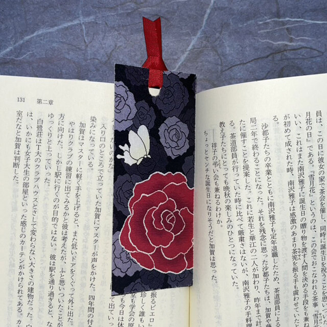美しい赤い薔薇と優雅な蝶が描かれたこのしおりは、読書を華やかに彩り心を癒してくれます。