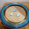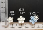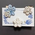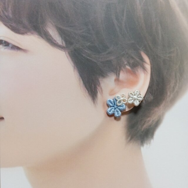 大きさの違う小さなお花の刺繍パーツの、オフ白と淡い水色の小さなイヤリング3個セットです。