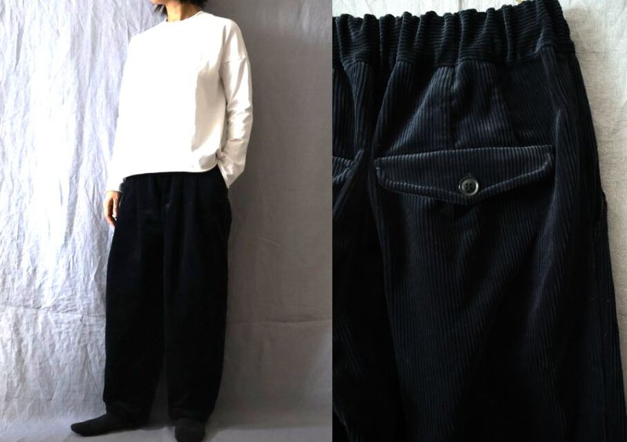 重みのあるコーデュロイの為、ウエストはホールド感のある太幅の総ゴム仕様(ゴム替え口あり)で、内側にcottonテープひもを通しています。