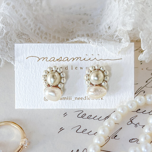 2種類のパールとヴィンテージビーズを合わせた、小ぶりな ピアス/イヤリングです。