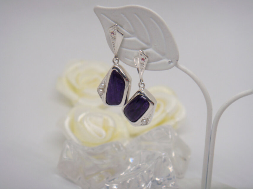 落ち着いた紫色が魅力的なスギライトを使ったシルバーピアスです。紫色に合わせた淡い色のピンクトルマリンで可愛さアップ!裏側に唐草模様の透かしを入れておりますので、後ろから見ても可愛いピアスとなってます。石に合わせてアシンメトリーに仕上げてますので、動きのある個性的な一品です。スギライトはヒーリングストーンでもあるので、お洒落をしながら心も癒されますね。