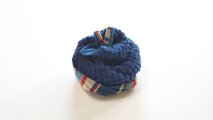 端にかけて先細になるようデザインしました。直接肌に接する中央部にはポコポコ感触のパイナップルボアを、左右の結び目側には先染めタータンチェック柄のコットンを配置しました。当ショップ既存の『肌ストール』パターンで異素材を合わせて作った秋冬マフラーです。