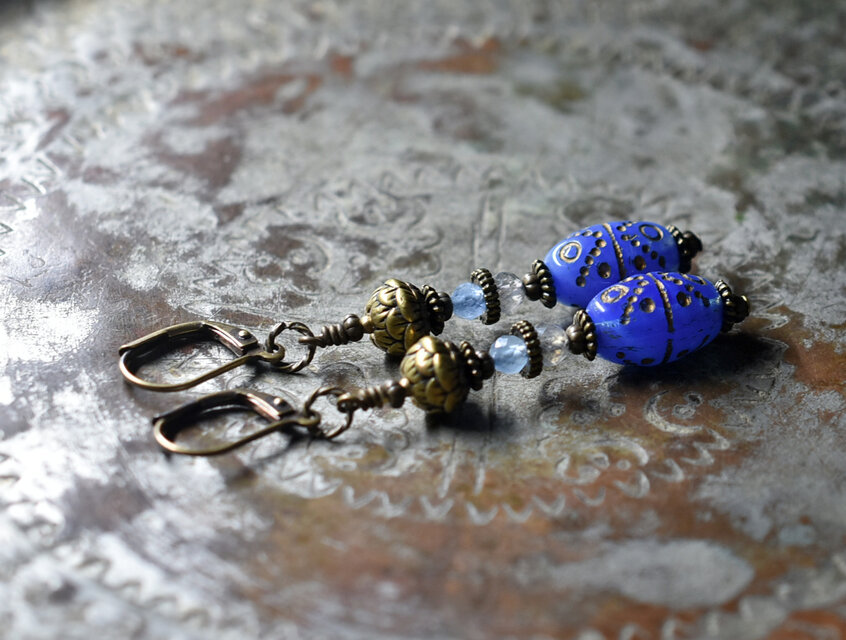 露草色チェコヴィンテージビーズとラブラドライト&アクアマリン、蓮華ブラスのピアス