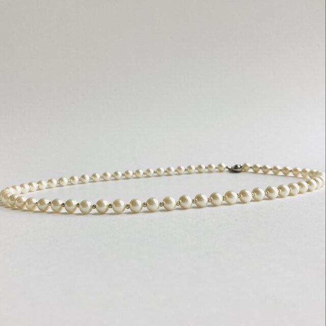 こちらは貝素材の原玉に、オリジナルカラーのパール塗料にて何層にも渡り重ね塗りを施した日本製貝パールネックレスになります。パールの間1つづつにグラズビーズを加えてカジュアルでお使い頂けるデザインに。パールカラーは、きめ細かい質感と優しい艶感でのクリームツートンカラー。ほのかにグラデーションがかった薄めのクリーム色です。パールサイズは直径約6mm弱と使いやすいサイズで、長さは標準的なプリンセスサイズよりややゆったり目の全長約50cmにて仕上げました。留め具部分にはパチッとはめるだけのボタンタイプを使用。