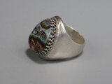 リングのサイズは14.5号、重さは18g、最大幅は22mm、手のひら側は7mm、金属部分は純銀です。