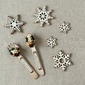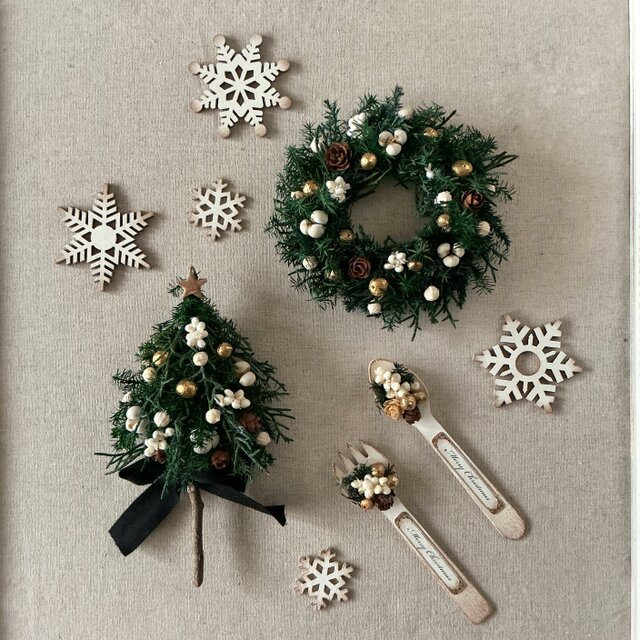 小さな小さなツリーとリース、カトラリー、スノーフレーク(大3小2)のディスプレイセット。