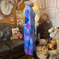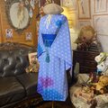 透明感のあるラベンダー地一面に白線の麻の葉文。裾や袖へ向けてコバルト〜ネイビー、ところどころにバイオレットがふわりと滲むグラデーションが、凛としてモダンな印象です。付属のロイヤルブルーの帯ベルト(ミント色の房飾り付き)でキュッと引き締めれば、すっきりIラインもふんわりAラインも思いのまま。白やシルバー小物でクリーンに、黒で引き締めてシティにも映える、和の気品を纏える一点物ワンピです。
