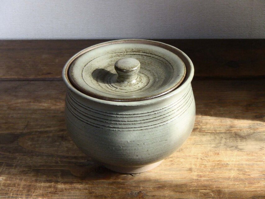 ボディに3本線(溝)を引き新蘭越釉を掛けてから焼成しています。