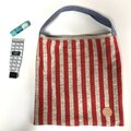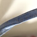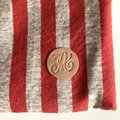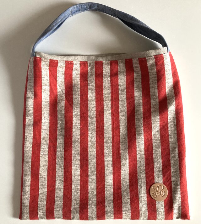 アンティークスタンプを型押ししたヌメ革のマークをつけました。接着剤で貼り付けています。接着芯は貼っていないのでくたっとしています。