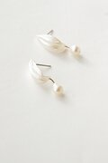 一枚の花びら×1粒のドロップパールがアクセントになった耳飾り。クレイで手作りしたしずく型の花びらは優しい丸みとウェーブが特徴で、仕上げに施したメタリックホワイトのコーティングは、パールのような輝きで一体感を。短いチェーンでドロップパールを繋ぎ、わずかな揺れも楽しめます。