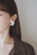 天然石をイメージした、ランダムなマーブル模様が特徴の耳飾り。ベージュ 、アイボリー、ホワイト、クリアのクレイを混ぜ合わせ、花びらを一枚ずつ丁寧に広げています。同じ模様・かたちは一つとしてない唯一無二の表情が楽しめるアクセサリーです。