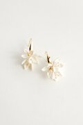 オレンジの花をモチーフにした "Neroli" シリーズは、あたたかみのある白、分厚くマットな花びらの小花が特徴です。クレイで花びらを一枚ずつ丁寧に広げ、中心にはパールコーティングされたガラスビーズを合わせました。繊細な3つの小花がギュッとあつまったひと房に、葉をイメージしたフラットな金具を合わせて華やかなデザインに。