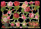 大小さまざまな薔薇のモチーフが散りばめられた、とてもエレガントな一枚。花瓶に飾られたバラや、まるでお庭で摘んできたばかりのような、かごに入れられたバラのモチーフもあります。贈り物やカードにそっと添えると素敵ですよ。