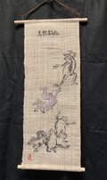 鳥獣戯画の一場面を墨で丹念に描き上げ、味わい深いタペストリーに仕上げました。