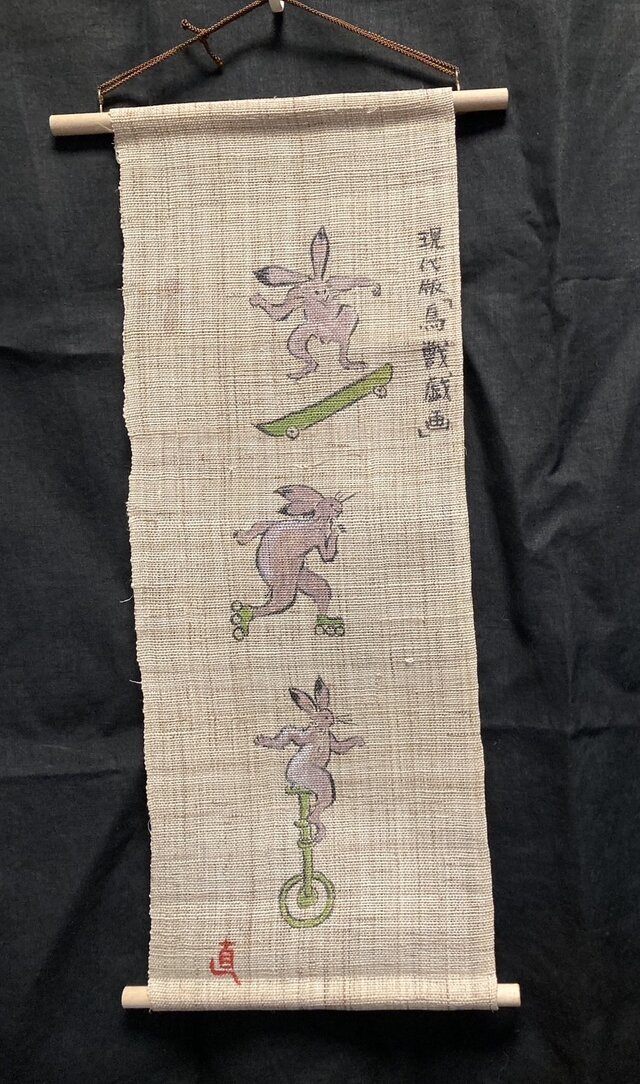 現代版鳥獣戯画の一場面を墨で丹念に描き上げ、味わい深いタペストリーに仕上げました。