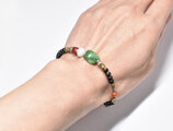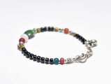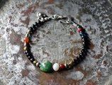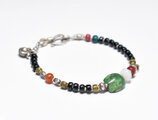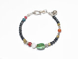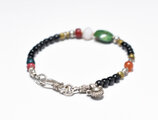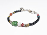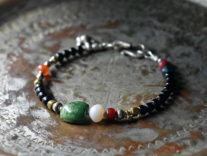 oldチベタンターコイズ、古代瑪瑙、濃&金赤ホワイトハーツ、ミゾーラムカーネリアン、エメラルドブルービーズ、oldチンシルバー&オリッサブラス、漆黒ビーズなどを繋いだブレスです。