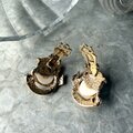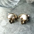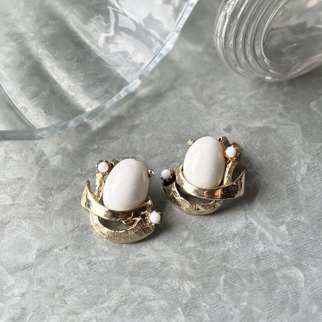ホワイトカボションとゴールドトーンのイヤリング。オーバル型カボションを、2種類のテクスチャーのテープで緩く囲んだような、抽象的なデザイン。