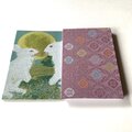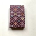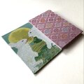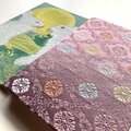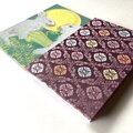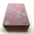 微かな柔らかさを感じる織物で、菱形の中に丸い花紋を配した「菱花紋」が織り出されている布地を使用しています。菱花紋は日本の伝統文様の一つで、幾何学的安定性と自然の有機的形態を融合させ、秩序と柔らかさを同時に表現する意匠です。慈愛の色『紫色』は、光の変化により奥行きと柔らかさを生み出し、繊細な織物の質感と相まって視覚的な優雅さと温かみを強調します。整然とした菱形の中に丸い花紋が配される事によりリズムと調和が生まれ、表紙の月兎の物語が持つ切なさと慈愛の感情とが自然に呼応します。幾何学と自然モチーフの融合は、日本美術の美意識や織物デザインの歴史的文脈を象徴しており、芸術的観点からも大変美しく、作品全体の物語性と視覚的魅力を高める効果を担っています。