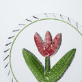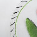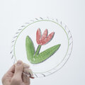 中央に描かれたチューリップは、ハンドペイントによる繊細なタッチとやわらかな色合いで表現されており、周囲を巡る線の反復が軽やかなアクセントとなっています。ガラスの透明感と相まって、光を受けるたびに表情を変えるのも魅力のひとつ。